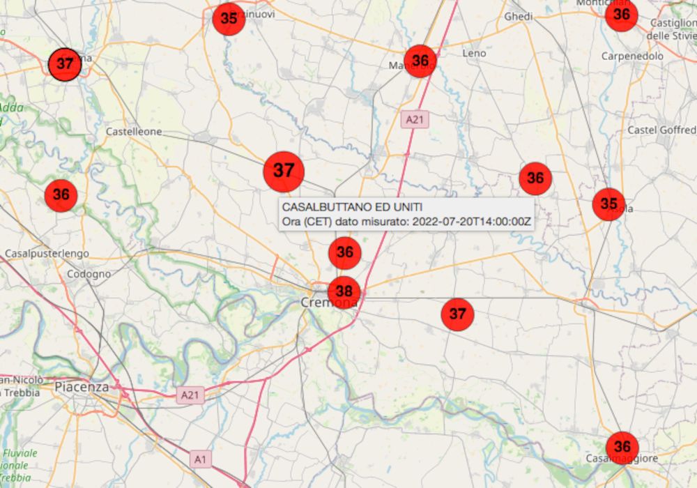 Il sito dell’Agenzia regionale di protezione dell’ambiente consente di monitorare la situazione in tempo reale nelle sei centraline della provincia di Cremona che misurano le temperature nel corso delle 24 ore, registrando anche i valori minimi e massimi. Alle 15,40 di oggi, ad esempio, in via Fatebenefratelli, quartiere Zaist si registravano 39 gradi, il picco più alto negli ultimi tre giorni. Più o meno alla stessa ora a Crema, via Camporelle, c’erano 37 gradi, come a Casalmaggiore, Casalbuttano e Pieve san Giacomo, dove sono localizzati gli altri punti di rilievo. 38 gradi, invece a Rivolta d’Adda.