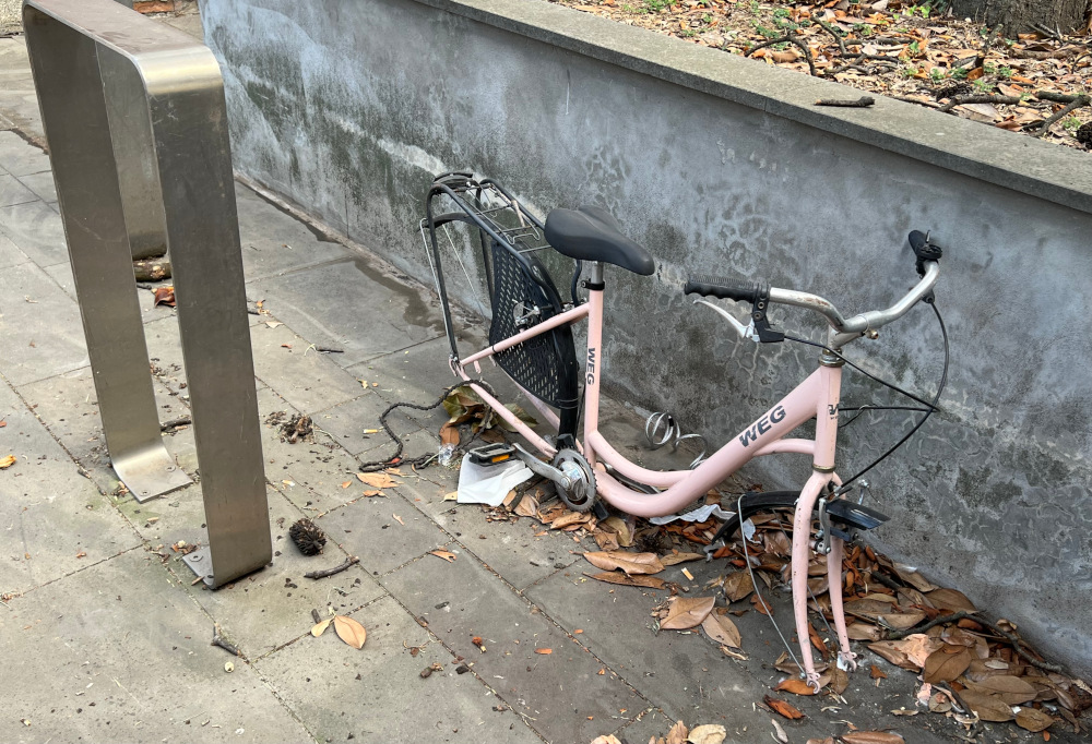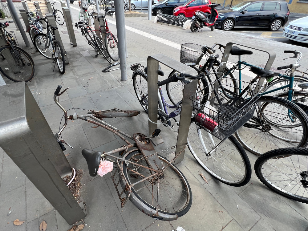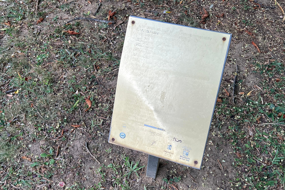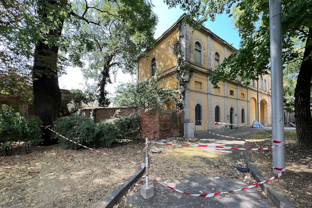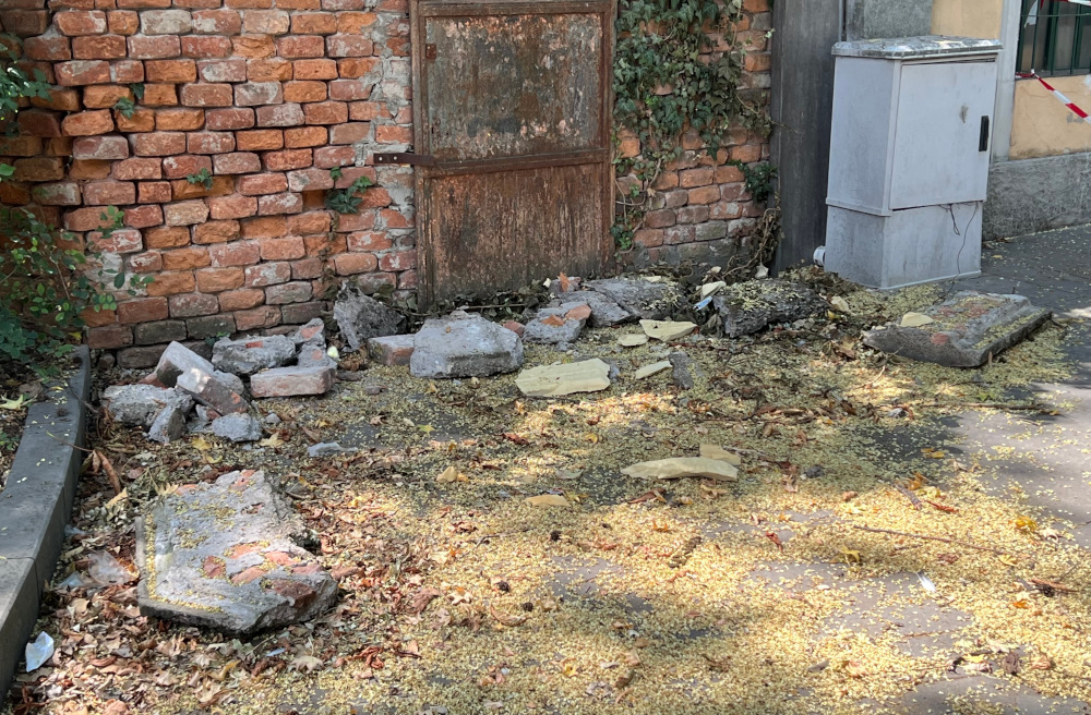 A sinistra della stazione, tra l’altro, sono ancora presenti le transenne che erano state posizionate a inizio luglio, quando la tromba d’aria ha divelto la copertura in lamiera di uno stabile di servizio di Rfi, facendola precipitare sul muretto di cinta. Il danno è ingente e nessuno è ancora intervenuto. A terra campeggia anche una targa, ormai illeggibile.