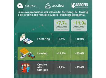 Il credito specializzato nei primi tre mesi del 2022 ha superato i livelli pre-pandemia, nonostante le incertezze generate dal contesto geopolitico e le tensioni macro-economiche. Il raffronto della nuova produzione con lo stesso periodo del 2019 evidenzia, infatti, una variazione positiva del +7,7%. I diversi comparti, tuttavia, mostrano trend differenti: a fronte di una decisa crescita del valore dello stipulato nel mercato del leasing, si registra una crescita più contenuta del turnover per il factoring e delle erogazioni di credito alle famiglie. E’ quanto emerge dall’analisi annuale, giunta alla 15esima edizione, dei dati aggregati relativi al credito specializzato, effettuata dalle tre associazioni di categoria (Assifact, Assilea e Assofin), cui aderiscono le banche e gli intermediari finanziari rispettivamente attivi nel settore del factoring, del leasing e del credito alle famiglie.