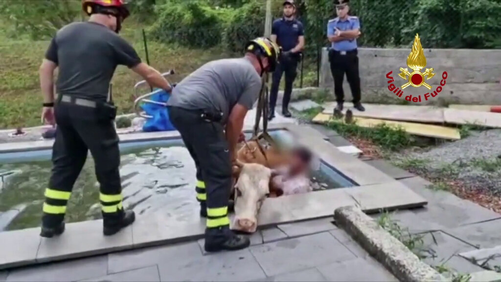 Una mucca si è tuffata in una piscina di un’abitazione a Porto Valtravaglia, sulla sponda varesina del Lago Maggiore. I Vigili del fuoco, dopo aver assicurato l’animale con un sistema di corde e fasce, lo hanno sollevato e affidato alle cure del proprietario.. Le immagini dell’incredibile salvataggio.