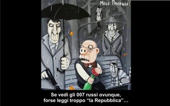 (Adnkronos) – “Se vedi gli 007 russi ovunque, forse leggi troppo la Repubblica…”. L’ambasciata russa a Roma reagisce con ironia e con una vignetta alle rivelazioni di oggi del quotidiano su una spia russa infiltrata nel comando della Nato di Napoli. La vignetta mostra un uomo seduto su una panchina che si guarda attorno spaventato, con al fianco un uomo con una pistola e un ombrello, mentre dietro si intravvedono altre due presunte spie. E in alto la scritta, “Signor cattivo?”.