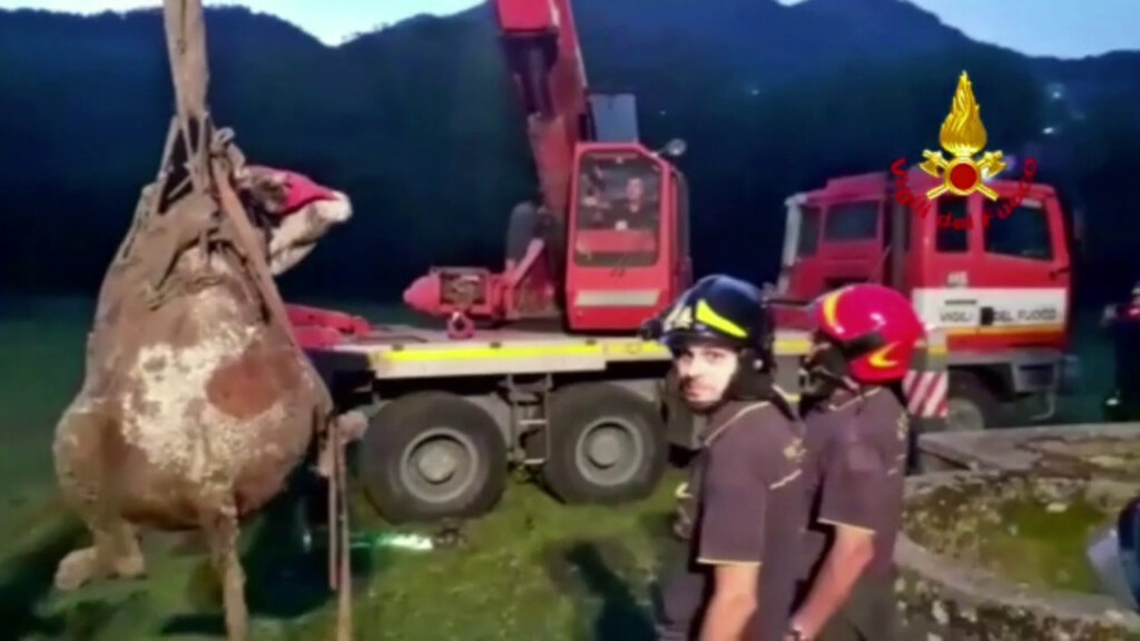 Volo di 15 metri per una mucca dentro un pozzo, salvata
