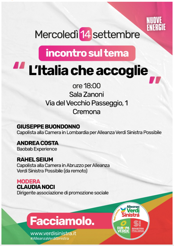 Incontro sul tema Accoglienza che Alleanza Verdi Sinistra Italiana-possibile ha organizzato per il giorno mercoledì 14 settembre ore 18.00 in Sala Zanoni a Cremona. Un confronto con cittadini e associazioni del terzo settore sul tema con il Candidato Capolista alla Camera nella circoscrizione di Cremona Giuseppe Buondonno e in collegamento video con Rahel Seium, Capolista alla Camera Abruzzo. Ospite speciale sarà Andrea Costa di Baobab Experience Roma, metre a moderare sarà Claudia Noci Dirigente associazione di promozione sociale.