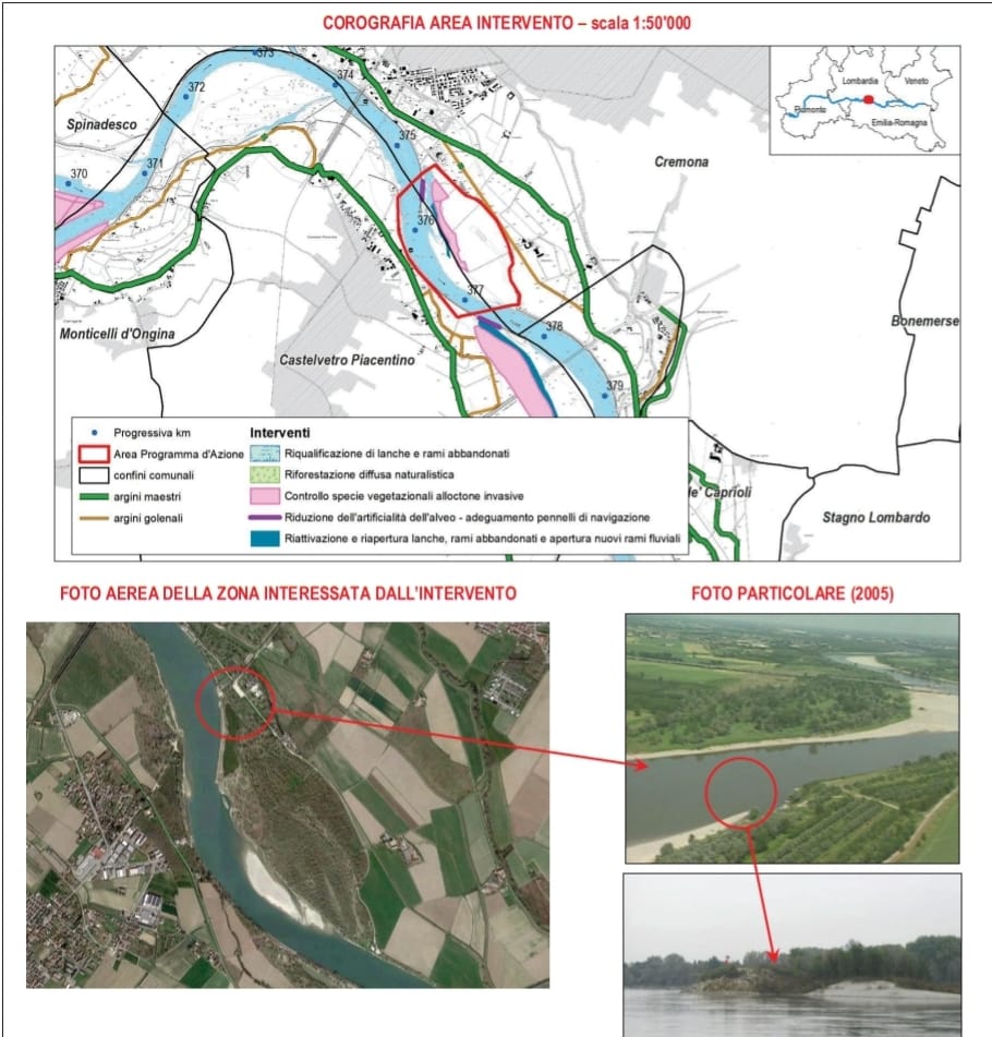 Tutto ciò allo scopo di “ridurre l’artificialità dell’alveo e riattivare un ramo laterale del fiume Po, a partire da una portata di 1000 m3 /s, portata superata mediamente circa 140 gg all’anno”, si legge nella sceda di intervento numero 20 del Piano di Rinaturazione del Po che riguarda complessivamente 56 siti.