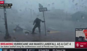 (Adnkronos) – L’uragano Ian colpisce la Florida con raffiche di vento a 240 chilometri orari e il meteorologo quasi vola via. Jim Cantore, giornalista di Weather Channel, si è ritrovato in mezzo alla tempesta. In strada, sotto una pioggia torrenziale, non ha interrotto il collegamento. “Datemi un secondo, mi aggrappo qui per un secondo”, ha detto Cantore che, dopo essere stato colpito da un ramo spezzato, si è ancorato ad un segnale stradale. “Jimmy, stai bene?”, la domanda dallo studio. “Ttutto bene, ma non si riesce a stare in piedi”, la risposta. Dallo studio, quindi, l’invito a rientrare.