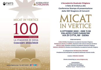 Obiettivo del cartellone è riportare a Siena “per questa storica occasione i massimi interpreti ed autori del nostro tempo, quali Mischa Maisky, Gidon Kremer, Gil Shaham, Sol Gabetta, Lisa Batiashvili, il Quartetto Hagen, Matthias Goerne e molti altri, che sono profondamente legati all’Accademia e presentando giovani talenti formatisi nelle ultime edizioni dei corsi estivi”. Primo in ordine assoluto e tra gli eventi di maggior rilievo della Stagione, in cartellone il concerto dell’Orchestra dell’Accademia Nazionale di Santa Cecilia diretta da Sir Antonio Pappano. A chiudere la prestigiosa kermesse Micat In Vertice 2022-2023 sarà sul palco del Teatro dei Rinnovati, venerdì 12 maggio, il ritorno della violinista Francesca Dego con l’Ort – Orchestra della Toscana, diretta da Jordan De Souza, tra i direttori emergenti più promettenti ed esuberanti dopo essersi distinto sulla scena musicale berlinese. Francesca Dego, una delle migliori e internazionalmente affermate violiniste della nuova generazione, allieva dell’Accademia Chigiana, in occasione del centenario della Micat In Vertice interpreta uno dei vertici della letteratura per violino e orchestra, il Concerto in re maggiore op.77 di Johannes Brahms. Il programma si conclude con la Sinfonia n.3 in la minore “Scozzese” op.56 di Felix Mendelssohn-Bartholdy.