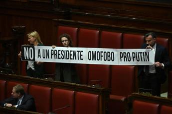 (Adnkronos) – ‘No a un presidente omofobo pro Putin’ è lo striscione che hanno esposto sui banchi dell’aula di Montecitorio Alessandro Zan e Rachele Scarpa, del Pd, appena iniziata la seduta per l’elezione del presidente. Gli assistenti parlamentari, intervenuti prontamente, hanno sequestrato lo striscione, chiaramente riferito a Lorenzo Fontana.