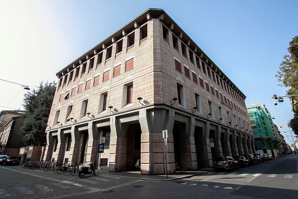L’immobile risale alla fine degli anni Cinquanta del secolo scorso, su progetto dell’architetto di fama Luigi Vagnetti (1915 – 1980) che l’aveva inserito nel contesto di quella che allora era piazza Cavour, già dominata dall’imponente edifico della Ras e dal retro di palazzo Comunale. Un progetto tormentato, che tra l’altro cadeva negli anni in cui il Comune stava ridisegnando la piazza stessa, fattore che impose vari cambi di direzione al progettista, in aggiunta alle richieste della Soprintendenza. I colori del cotto dei palazzi esistenti venivano richiamati dall’utilizzo