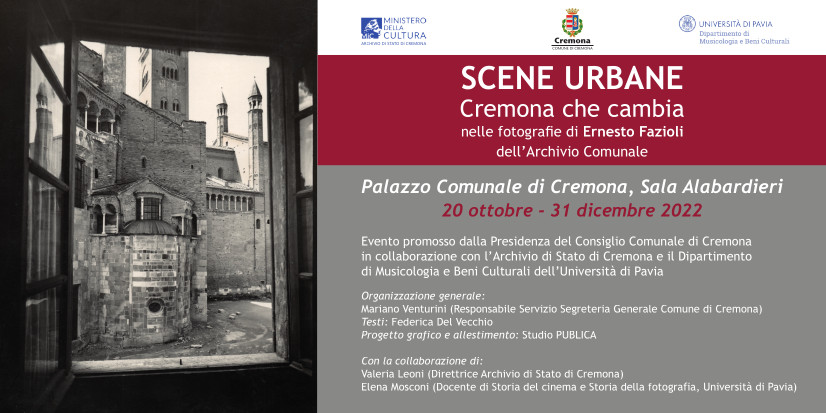 Dal 20 ottobre al 31 dicembre 2022 la Sala Alabardieri di Palazzo Comunale ospiterà la mostra Scene urbane – Cremona che cambia nelle fotografie di Enrnesto Fazioli dell’Archivio Comunale. L’evento è promosso dalla presidenza del Consiglio Comunale di Cremona in collaborazione con l’Archivio di Stato di Cremona e il Dipartimento di Musicologia e Beni Culturali dell’Università di Pavia.