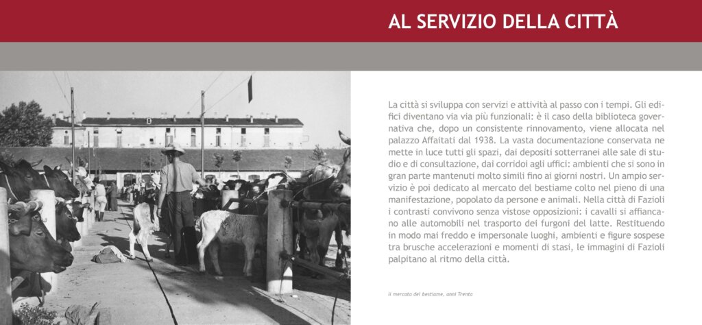 Le fotografie di Ernesto Fazioli scelte per questa mostra, che si può visitare negli orari di apertura del Palazzo Comunale (dal lunedì al sabato, dalle 9 alle 18), sono collocate in otto espositori ciascuno contrassegnato da un pannello con una breve descrizione: Luci sul Duomo, La “Fabbrica” del Palazzo Comunale, La Galleria come riparo, Vuoto al centro (storico), Uomini all’opera, Educazione moderna, Case per tutti, Al servizio della città.