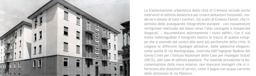 Nell’archivio fotografico del Comune di Cremona spicca un fondo di circa 700 immagini – oggetto di un lavoro di riordino e catalogazione – che documentano le trasformazioni della città dagli anni Trenta agli anni Cinquanta, riconducibili al fotografo Ernesto Fazioli.