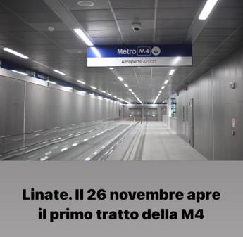 (Adnkronos) – “Linate. Il 26 novembre apre il primo tratto della M4”. L’annuncio è del sindaco di Milano Giuseppe Sala che sul suo profilo Instagram pubblica una ‘story’ indicando la data di apertura della nuova linea ‘blu’ della metropolitana che attraverserà il capoluogo da est a ovest, collegando l’aeroporto milanese alla stazione San Cristoforo, passando per il centro cittadino.