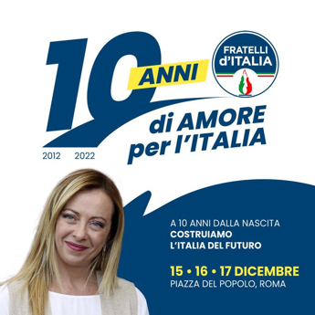 (Adnkronos) – Festeggia 10 anni Fratelli d’Italia, partito nato il 16 dicembre del 2012. La formazione guidata da Giorgia Meloni, oggi anche premier, sceglie Piazza del Popolo per la tre giorni che vedrà la comunità del primo partito italiano incontrarsi nel cuore di Roma, dal 15 al 17 dicembre. Sono ’10 anni di amore per l’Italia’, si legge nei manifesti che mostrano il volto di Meloni. ‘Costruiamo l’Italia del futuro’, aggiunge l’invito che circola sui canali social dei Fratelli d’Italia. Un passato da ricordare, per una forza che in dieci anni è arrivata al 26% delle ultime elezioni, lo scorso 25 settembre. Oggi a Palazzo Chigi con la sua leader. Ma anche progetti per il futuro, a partire dalla competizione nel Lazio, per il dopo Zingaretti.