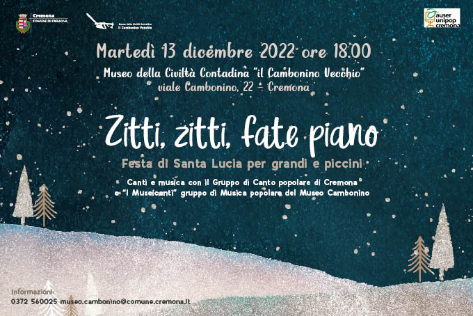 Zitti, zitti fate piano, vien la Santa da lontano, porta a tutti dolci e doni, soprattutto ai bimbi buoni… Con questi versi iniziali della nota filastrocca il Museo della civiltà contadina “Il Cambonino vecchio” (viale Cambonino, 22) invita a festeggiare Santa Lucia. Martedì 13 dicembre alle ore 18 grandi e piccini sono infatti invitati a partecipare alla festa per grandi e piccini, tradizionale appuntamento natalizio offerto dal Museo.