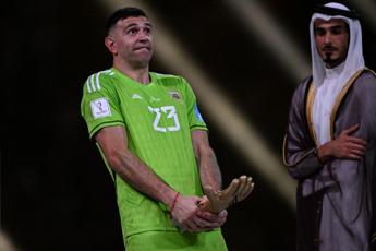 (Adnkronos) – Mondiali 2022 da incorniciare, una premiazione da dimenticare. Emiliano ‘Dibu’ Martinez, portiere dell’Argentina campione del mondo, nella premiazione dopo la finale vinta ai rigori contro la Francia si distingue per un gestaccio. Il portiere dell’Aston Villa, premiato come miglior portiere del torneo, riceve il trofeo e lo porta all’altezza del pene: il comportamento ovviamente non passa inosservato. Fotografi e operatori ‘immortalano’ il gesto che, a giudicare dalle foto, lascia a dir poco perplessi anche coloro che partecipano alla premiazione.