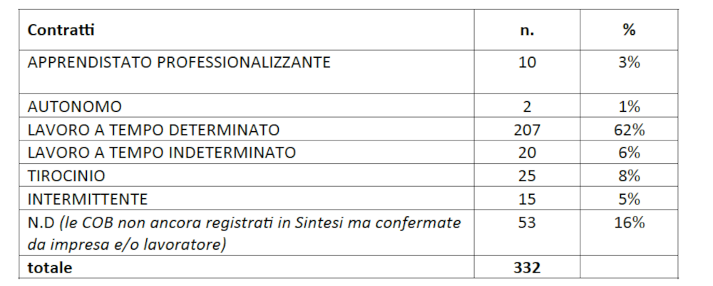 Il 62% dei contratti offerti è stato a tempo determinato (207 il numero assoluto); soltanto il 6% è stato a tempo indeterminato (20), l’8% sono stati tirocini. Appena il 3% gli apprendistati professionalizzanti, tipologia di contratto utilizzata solo 10 casi.
