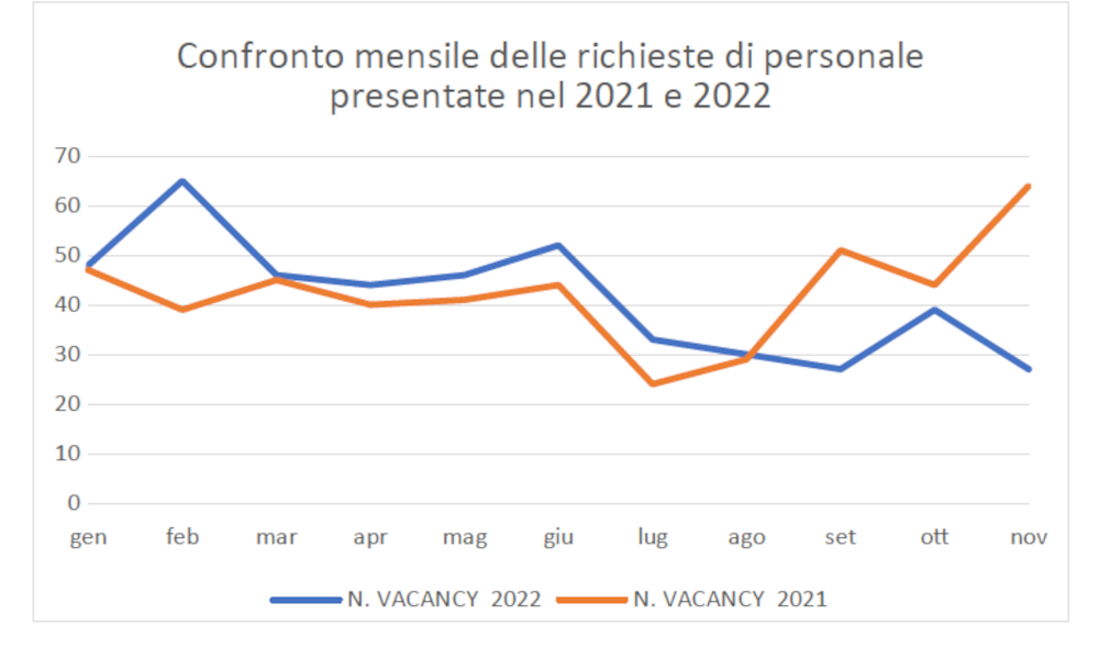 Nel corso del 2022 gli operatori dei Centri per l’Impiego hanno incontrato molte difficoltà nel reperimento di candidati da proporre alle imprese, nonostante i numerosi canali utilizzati per promuovere le offerte di lavoro, una difficoltà è condivisa dagli operatori accreditati e le agenzie per il lavoro. Sono stati inviati 1.979 candidati alle imprese: una diminuzione di circa 16% rispetto all’anno precedente.