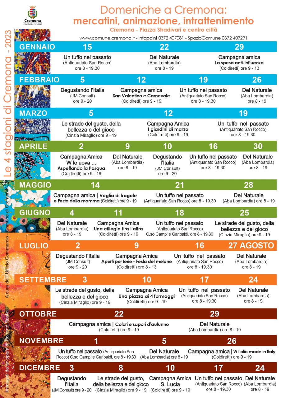 “40 eventi che animeranno le domeniche in centro città con proposte di qualità e di valorizzazione dei prodotti della tradizione e dei prodotti tipici del nostro territorio e regionali. Non mancherà il mercato dell’antiquariato la terza domenica del mese. Particolare attenzione verrà data alle famiglie con momenti di intrattenimento dedicati ai bambini. Un’ulteriore occasione per vivere il centro storico di Cremona nelle quattro stagioni dell’anno”, dichiara l’Assessore al Commercio e al Turismo Barbara Manfredini.