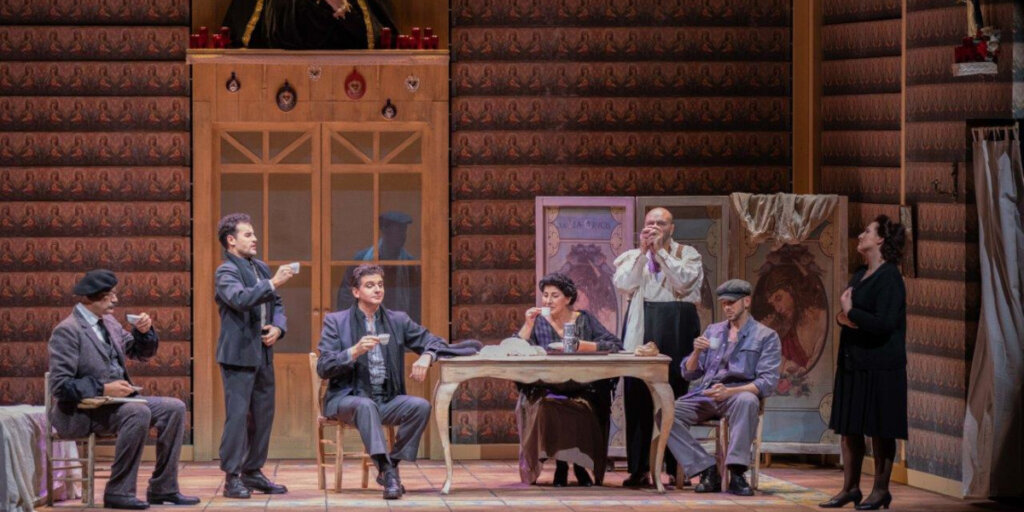 Certo nel passaggio dal testo drammaturgico al libretto d’opera varie cose mutano: la lingua che è più italianizzata, l’ironia che è meno presente, la vicenda stessa che prende risvolti diversi. Ma quello che resta inalterato è il profondo rapporto che questa vicenda ha con il teatro. In cui i cantanti sembra quasi che recitino più che cantare, e in cui la musica diviene l’elemento di maggiore narrazione, più che le parole. Ecco allora apparire la contrapposizione tra il vicolo vociante e litigioso, e l’interno di casa Jovine; ecco il bombardamento che assume caratteri quasi apocalittici; ecco l’America che arriva con tutto il suo retaggio musicale.