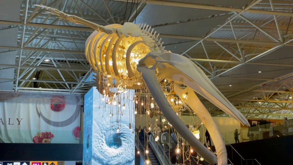 Un’opera d’arte contemporanea che riproduce in dimensioni originali, 12 metri per 700 chili di peso, lo scheletro di una balena, illuminato al suo interno da lampade provenienti da tutto il mondo. E’ “Grande anima” dell’artista Marcantonio, presentata all’aeroporto Leonardo Da Vinci, alla presenza, tra gli altri, dell’Amministratore delegato di Aeroporti di Roma Marco Troncone, del Presidente dell’Enac Pierluigi Di Palma e del Ministro della Cultura Gennaro Sangiuliano.