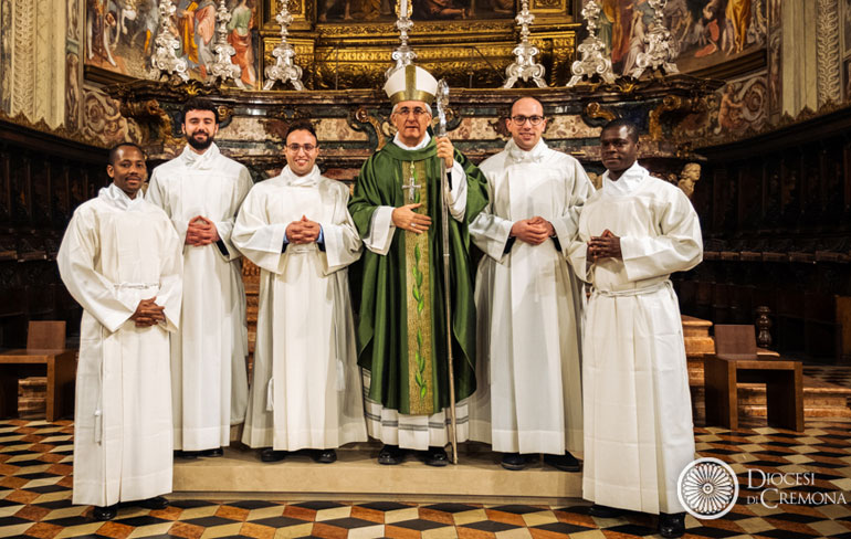 La comunità diocesana si è stretta domenica 29 pomeriggio intorno a cinque seminaristi che in Cattedrale hanno ricevuto i ministeri del Lettorato e dell’Accolitato. Una celebrazione essenziale, presieduta dal vescovo Antonio Napolioni, fatta di segni e preghiera raccolta, apertasi con una lunga processione di seminaristi, vicari, parroci e rappresentanti del Capitolo della Cattedrale. Il libro delle Sacre scritture e il vassoio del Pane (patena) sono stati i simboli dei Ministeri, conferiti rispettivamente a due religiosi dei Missionari di Gesù e di Maria (la cui Casa madre ha sede nella diocesi di Kpalime, in Togo, e in formazione a Cremona) fra Godfroy Agbodgi e fra Daniel Dossou Kossi, diventati Lettori, e tre studenti di quinta Teologia del Seminario vescovile di Cremona, Alberto Fa’ di Pizzighettone, Valerio Lazzari di Vicomoscano e Giuseppe Valerio di Spinadesco, diventati accoliti.