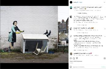 (Adnkronos) – Banksy ha svelato una nuova opera d’arte sulla violenza domestica contro le donne. Nel giorno di san Valentino, l’artista ha postato sul suo profilo Instagram le immagini del suo lavoro realizzato su un muro bianco. Intitolato ‘Valentine’s day mascara’, raffigura una sorridente casalinga degli anni Cinquanta che indossa guanti gialli da bucato e un grembiulino sopra il vestito e sembra spingere il marito in un congelatore. la donna ha un occhio gonfio e un dente scheggiato che diventa più visibile quanto più si guarda l’opera da vicino.