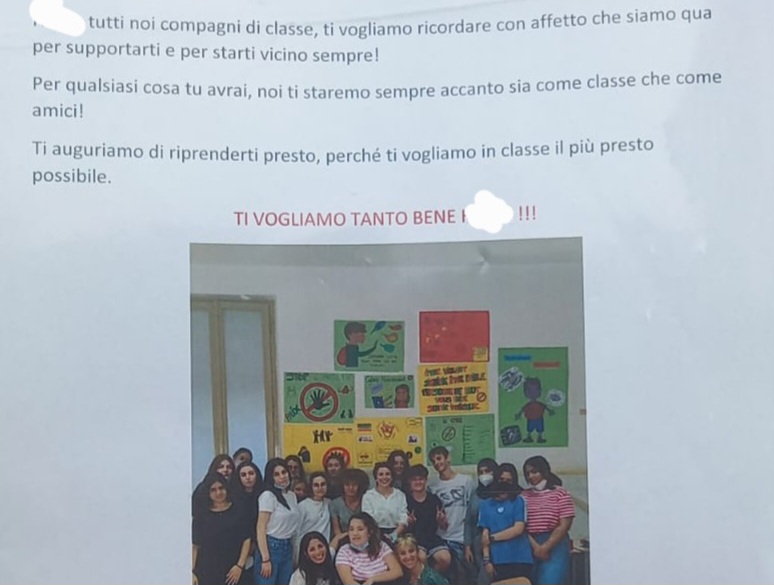 Gli alunni, un po’ scossi per l’accaduto, si sono scattati una foto di gruppo con la prof. di Francese Francesca Savoini, hanno scritto un pensiero affettuoso ed hanno scelto uno di loro, Simone, per recapitare il tutto alla giovane, in osservazione all’ospedale. Il messaggio appare semplice e carico d’amore: “Ti vogliamo ricordare che siamo qui per supportarti e per stare con te sempre, per qualsiasi tua esigenza. Ti auguriamo di riprenderti in fretta, perché ti desideriamo presto con noi”. E la notizia dov’è? “Sta proprio qui, nella sensibilità di diciassette adolescenti” spiega la docente, che aggiunge: “Gli alunni mi hanno commossa. È bello poter segnalare l’umanità e l’altruismo anche in una generazione, spesso alla ribalta delle cronache, per comportamenti improntati sulla negatività, sul bullismo e sulla violenza”.