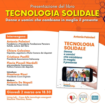 A promuovere l’incontro ‘Passo civico’, ‘Cuore digitale e il centro studi ‘La Parabola’. “I nomi delle tre associazioni culturali che organizzano la presentazione e che ringrazio, identificano -spiega ancora Palmieri- l’essenza della tecnologia solidale. ‘Cuore digitale’ unisce l’uso delle tecnologie alla dimensione umana. ‘Passo civico’ indica una attenzione attiva a ciò che avviene attorno a noi. ‘La Parabola’ indica non solo una traiettoria che si estende nello spazio e nel tempo ma anche la capacità di saper comunicare una esperienza”.