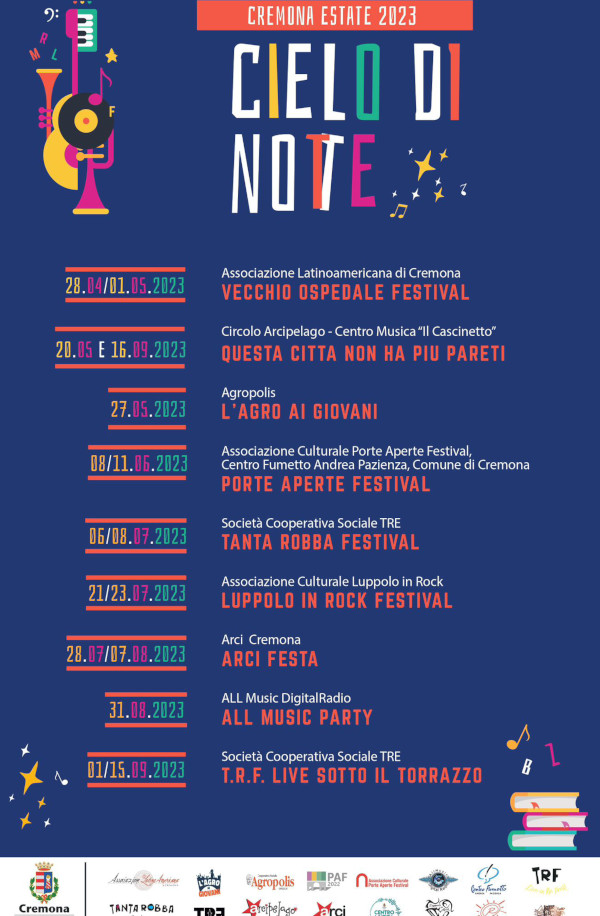 Agli organizzatori infine il compito di fare una rapida carrellata dei singoli appuntamenti di Cielo di Notte, edizione 2023, che verranno poi di volta in volta ampiamente illustrati all’approssimarsi degli eventi, partendo dal primo, in programma dal 28 aprile, Vecchio Ospedale Festival, a cura dell’Associazione Latinoamericana di Cremona, per arrivare ai Live sotto il Torrazzo, i concerti in piazza del Comune di cui quest’anno si occuperanno gli organizzatori del Tanta Robba Festival.