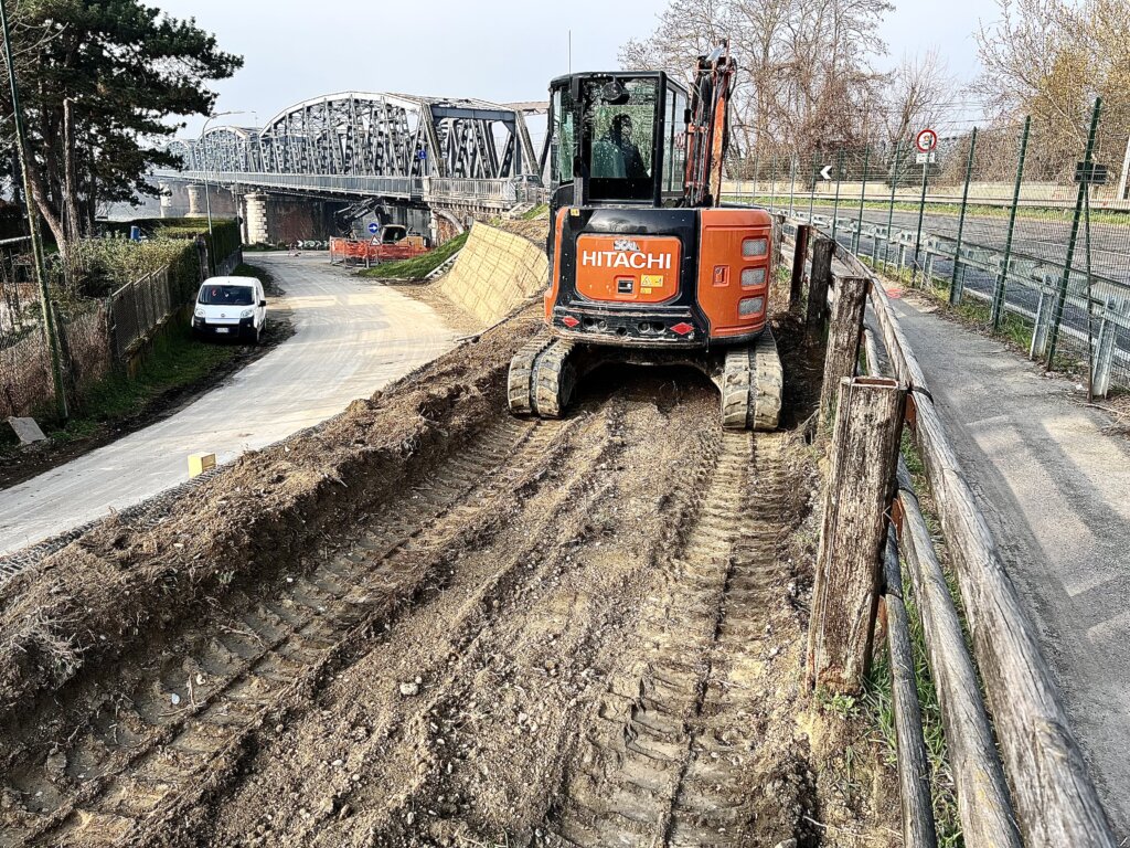 Proseguono spediti i lavori appena prima del ponte sul Po, per l’allargamento del tratto di pista ciclabile lungo la statale 10, tra la passerella in ferro e via Bortini, la strada che scende verso il Lungo Po Europa. Da fine febbraio il cantiere dell’impresa Concarini di Roncole ha già realizzato il terrapieno che consentirà quasi il raddoppio dell’attuale tratto di ciclabile, portandolo ad una larghezza paragonabile a quello che si trova sulla sponda piacentina.