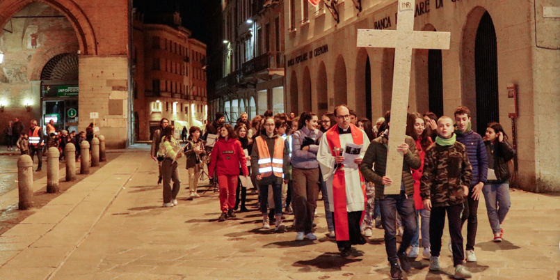 La processione, guidata da don Stefano Montagna, vicario dell’unità pastorale “Sant’Omobono” e insegnante di religione alla scuola Sacra Famiglia, si è articolata in quattro stazioni, preparate dalle scuole Beata Vergine e Sacra Famiglia, i cui alunni hanno letto i passi del Vangelo, e introdotte da un momento musicale. La prima stazione – “Gesù nell’orto degli Ulivi” – davanti alla Cattedrale; poi “Gesù condannato a morte”, in largo Boccaccino; quindi di nuovo in piazza del Comune la terza stazione, “Gesù sale al Calvario e viene crocifisso”; concludendo all’interno del Duomo meditando “Gesù muore in croce”.
