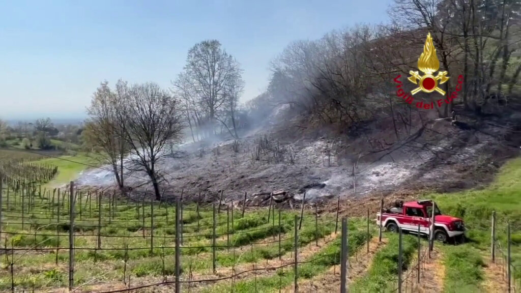Incendio di vegetazione sulle colline di San Colombano al Lambro. A fuoco oltre 3.000 metri quadri di sottobosco. Dalla tarda mattinata i Vigili del fuoco sono al lavoro a protezione di alcune abitazioni lambite dalle fiamme.