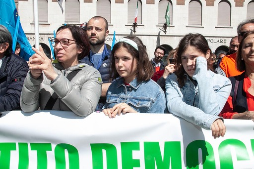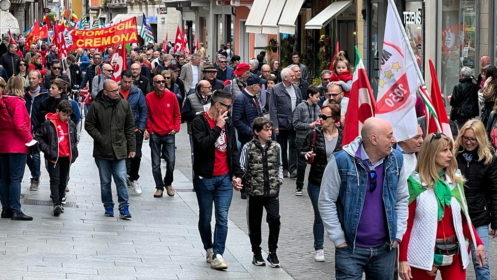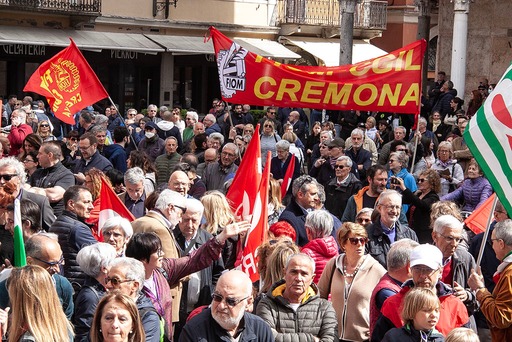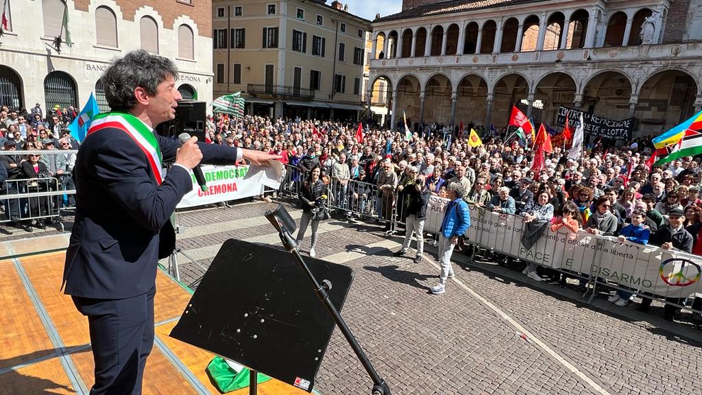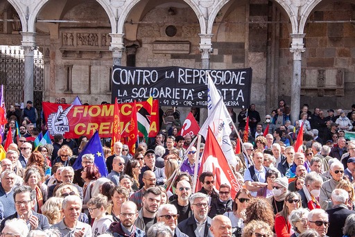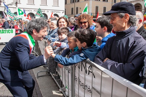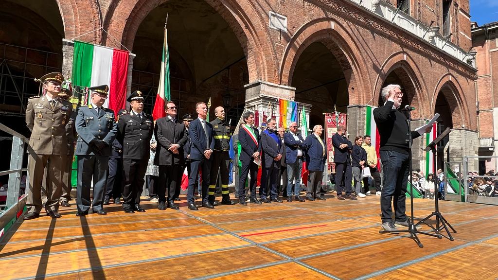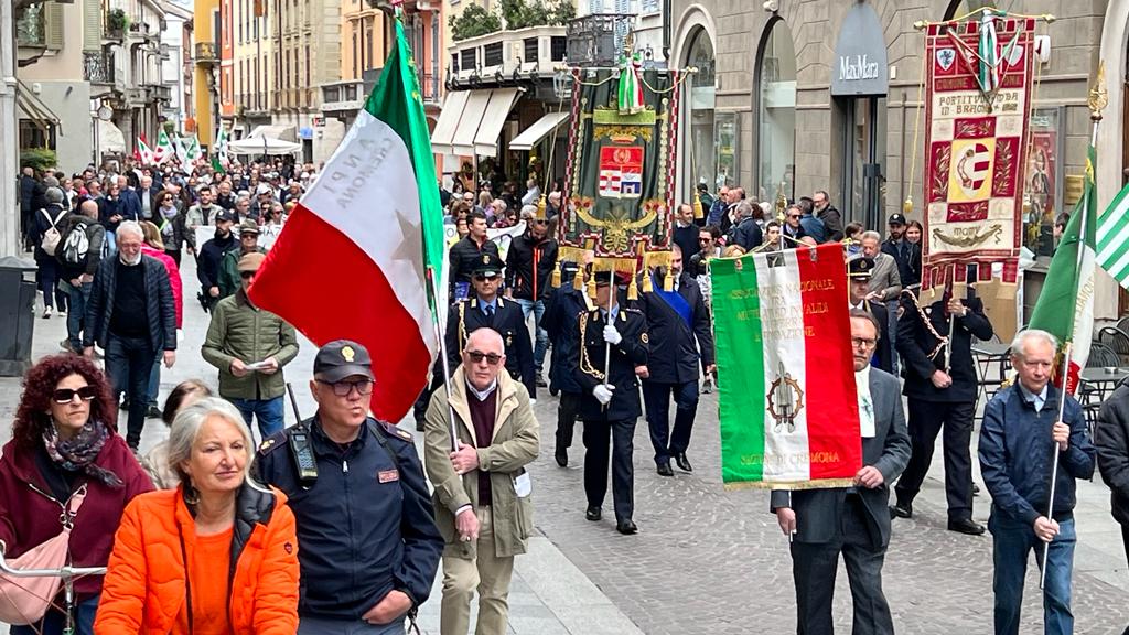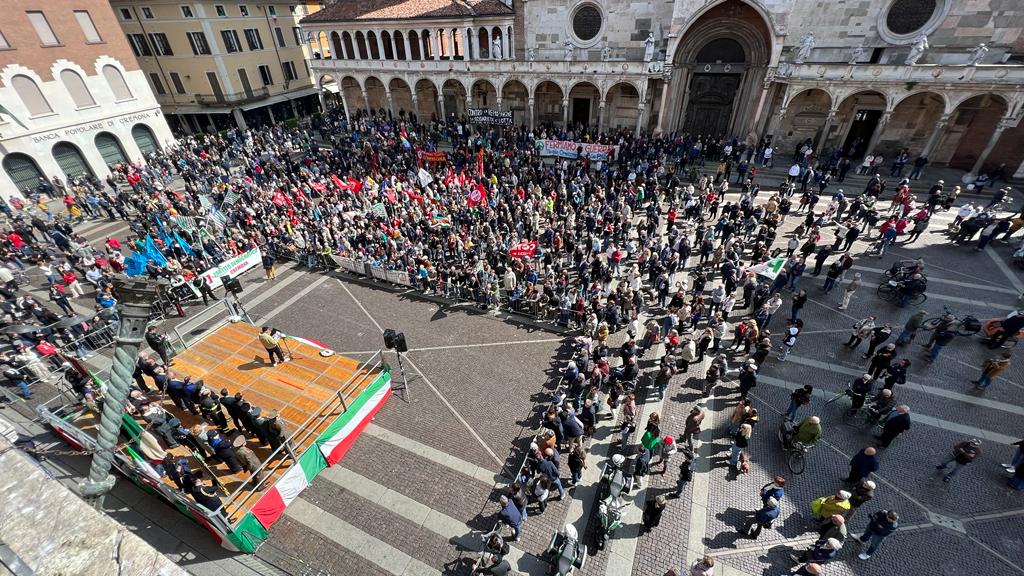Una celebrazione del 25 aprile che quest’anno ha visto una larghissima partecipazione popolare a Cremona, con piazza del Duomo gremita in mattinata, parte conclusiva del corteo iniziato a San Luca. L’avvio della giornata era stato al cimitero monumentale con la Messa e la deposizione di corone d’alloro e fiori alla Cappella ai Caduti Civili, alla Cappella dei fratelli Di Dio, ai monumenti commemorativi dei soldati trucidati a Cefalonia e Corfù, dei Caduti per la Resistenza e all’Altare della Patria. Il complesso Bandistico Città di Cremona ha poi accompagnato il corteo che si è concluso in piazza del Duomo, dove hanno parlato gli studenti Paola Roversi e Ali Bakr del Liceo di Scienze Umane “S. Anguissola”; Paolo Mirko Signoroni, Presidente della Provincia e Giancarlo Corada per le Associazioni partigiane di Cremona. “Nella Costituzione non c’è la parola antifascismo perchè tutta la Costituzione è antifascista”, un passaggio del suo intervento, una risposta indiretta al presidente del Senato La Russa.