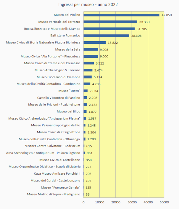 Il museo che ha registrato il maggior numero di visitatori è stato il Museo del Violino con 47.050 ingressi (22%; nel 2021 erano stati 27.452), seguito dal Museo verticale del Torrazzo con 33.330 ingressi (16%): un balzo in avanti considerevole per il monumento – simbolo di Cremona che lo scorso anno non compariva tra primi tre più visitati della provincia.