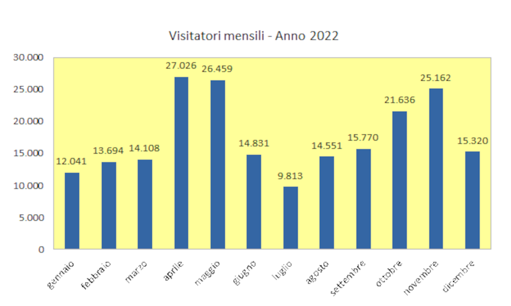 Il maggior numero di visitatori lo scorso anno c’è stato nei mesi primaverili di aprile (27.026) e maggio (26.459), seguiti dai mesi autunnali di novembre (25.162) e ottobre (21.636).