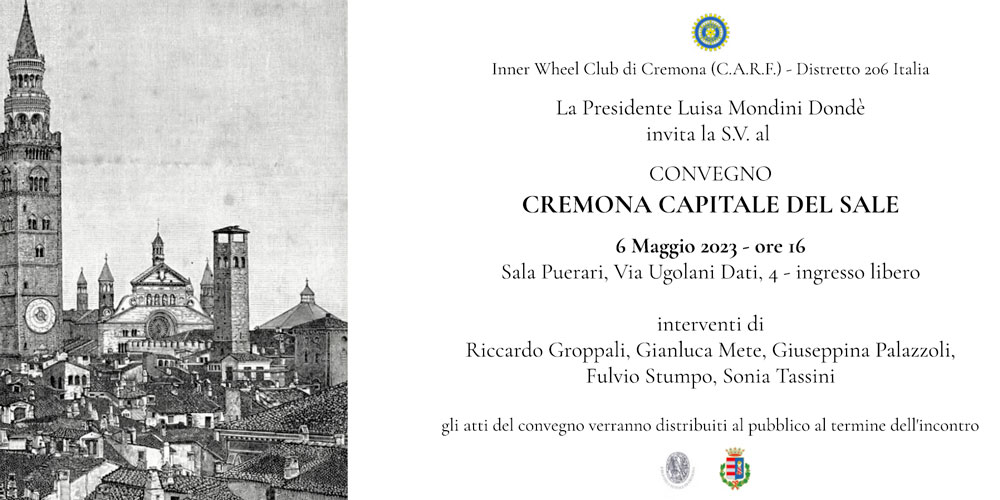 Ad aprire i lavori sarà la presidente dell’Inner Wheel Cremona Mondini Dondè: “Il club organizza, con il patrocinio e collaborazione del Comune di Cremona e con il patrocinio della Biblioteca Statale di Cremona, l’ottavo convegno a carattere storico, un’iniziativa avviata nel 2014 il tema scelto è perché il sale è un elemento fondamentale per la vita dell’uomo e perciò ha causato guerre per il suo possesso e ha avuto nella Cremona del passato una piccola capitale”.