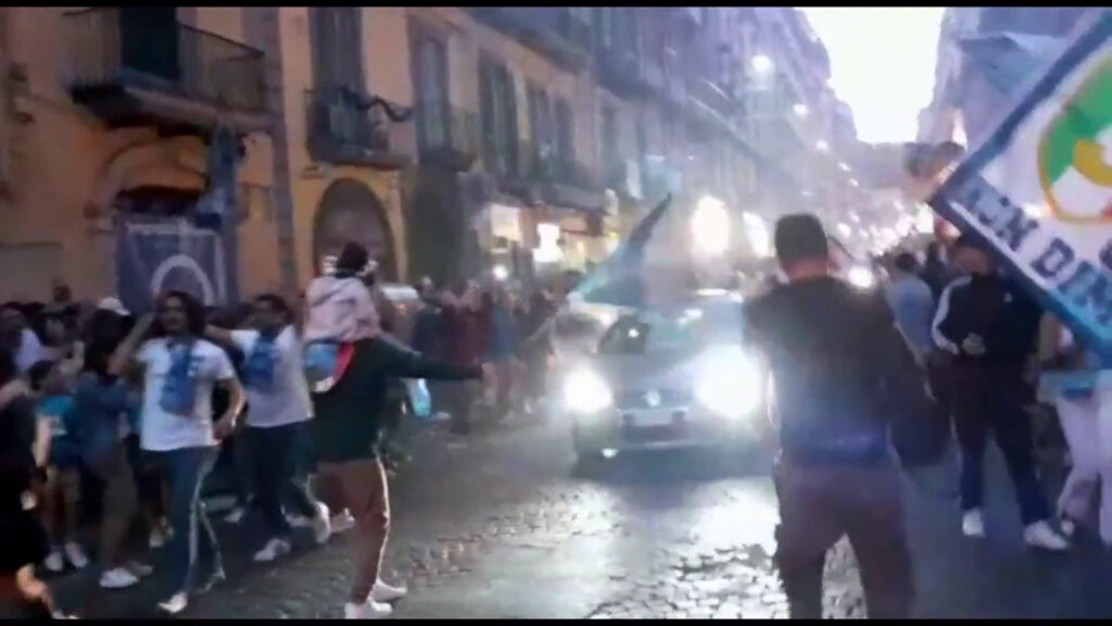 Napoli in festa per la vittoria dello scudetto. In centro città, in assenza del divieto di transito veicolare, è sfilata di auto e motorini. I marciapiedi pieni di gente festante.
