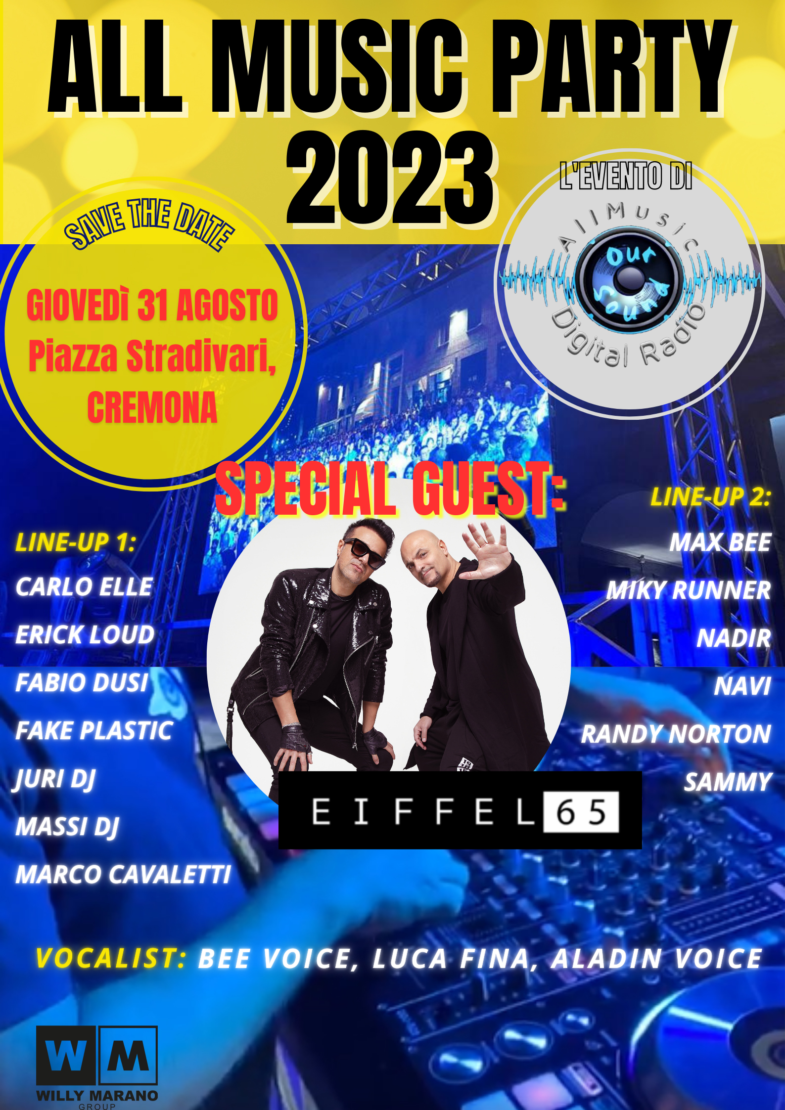 Saranno nientemeno che gli Eiffel 65 gli ospiti d’eccezione per l’edizione 2023 dell‘All Music Party, evento promosso All Music DigitalRadio: l’appuntamento è in piazza Stradivari, il 31 agosto.Un gruppo musicale italiano conosciuto a livello internazionale, noto ai giovani, ma anche ai meno giovani.