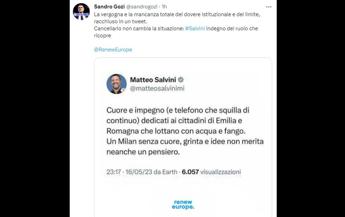 “Associare in un tweet la sofferenza e il dolore delle popolazioni dell’Emilia Romagna con quello dei tifosi del Milan ci spiega meglio di qualunque altra cosa l’inadeguatezza di Matteo Salvini. Il leader della Lega rispetti il dolore e, anziché giocherellare con il telefonino, agisca immediatamente con l’autorità e le competenze del suo ruolo di vicepresidente del Consiglio dei ministri e ministro delle Infrastrutture e dei Trasporti”, dichiara la deputata del Pd Ouidad Bakkali cui fa eco il senatore dem Daniele Manca, emiliano: “Dopo ‘belli ciao’ Salvini non trova di meglio che associare in un tweet la tragedia che si sta consumando in Emilia, il suo lavoro che dovrebbe essere quello di ministro e la partita di calcio. Resosi conto dell’oscenità scritta ha poi fatto cancellare il tweet. Ma forse sarebbe il caso che fermasse la sua bestia perché quel tweet è solamente indegno di un rappresentante delle nostre istituzioni”.