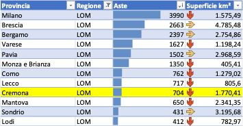 Per quanto riguarda Crema, centro principale della provincia dopo il capoluogo ma, secondo le dichiarazioni del 2021, quello con il reddito pro-capite più alto, il numero di lotti in vendita è stato inferiore a quello di Soresina di sole quattro unità, pur avendo quasi quattro volte il numero della popolazione.