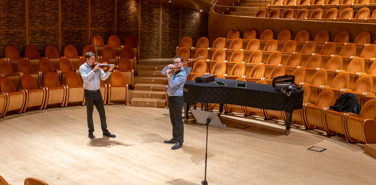 Inoltre, Noax Bendix-Balgley ha tenuto una lezione aperta, trasmessa live sul canale YouTube dello Stauffer Center for Strings. Con lui hanno lavorato due allieve del corso Concertmaster – Arevik Ivanyan e Anastasia Subrakova-Berreux – eseguendo rispettivamente il solo di violino da Heldenleben di Richard Strauss e l’Introduction et Rondò Capriccioso di Camille Saint-Saëns.