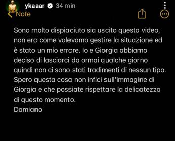 (Adnkronos) – Il frontman dei Maneskin, Damiano David, e la storica fidanzata Giorgia Soleri si sono lasciati. A confermarlo è lo stesso artista attraverso le stories di Instagram dopo la diffusione di un video su TikTok, poi diventato virale, nel quale si vede il cantante della band romana baciare un’altra ragazza in un locale. “Sono molto dispiaciuto sia uscito questo video, non era come volevamo gestire la situazione ed è stato un mio errore – precisa Damiano su Instagram -. Io e Giorgia abbiamo deciso di lasciarci da ormai qualche giorno, quindi non ci sono stati tradimenti di nessun tipo. Spero questa cosa non infici sull’immagine di Giorgia e che possiate rispettare la delicatezza di questo momento”, la richiesta del cantante sui social.