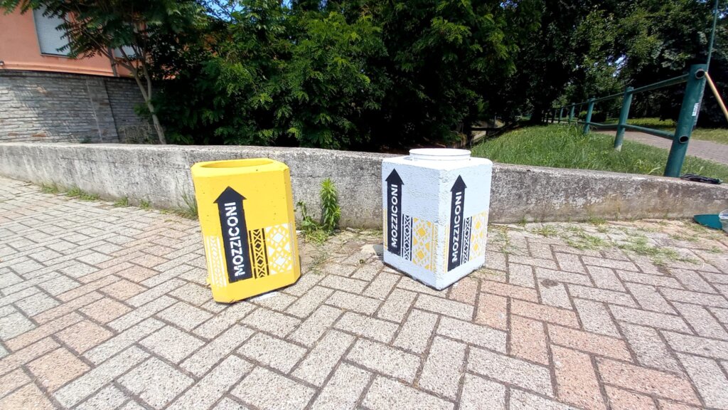 Oltre agli stencil sono state create delle ceneriere, dando una nuova veste grafica ai cestini di cemento non più necessari trasformandoli in nuovi elementi di arredo urbano; queste attrezzature sono state poste all’esterno delle attività commerciali ed associative del Quartiere e dalle stesse realtà sono state adottate poiché ne garantiscono gratuitamente il loro svuotamento.