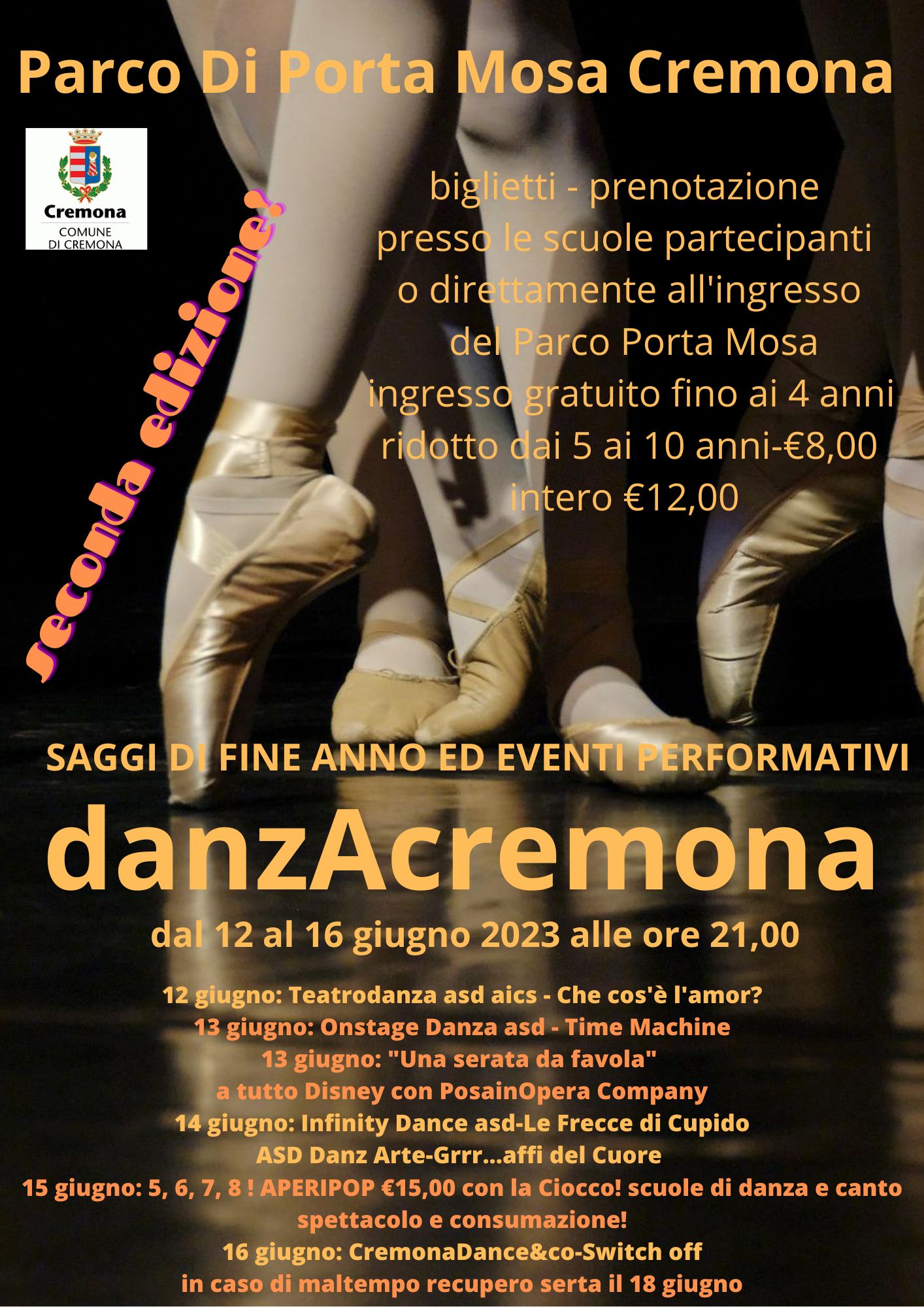 Dal 12 al 16 giugno, al Parco di Porta Mosa, in via Gaspare Pedone, si terrà la seconda edizione di “danzAcremona”, rassegna di saggi ed eventi che ha lo scopo di portare su un palco importante il lavoro di un anno delle scuole di arti performative cremonesi.
