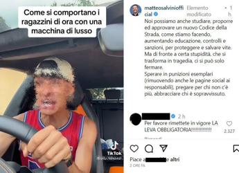 (Adnkronos) – All’indomani del tragico incidente in zona Casal Palocco a Roma, dove ha perso la vita un bimbo di 5 anni in seguito a uno scontro tra la Smart guidata dalla mamma e un suv Lamborghini con a bordo cinque giovani, il ministro delle Infrastrutture Matteo Salvini posta su Instagram il video con protagonista uno dei ragazzi che si sarebbe trovato sul suv al momento dello schianto. Nel video, pubblicato su TikTok poche ore prima dell’incidente dal ragazzo (che farebbe parte di un collettivo di youtuber), si scherza su “come si comportano i ragazzini di ora con una macchina di lusso”. “Noi possiamo anche studiare, proporre ed approvare un nuovo Codice della Strada, come stiamo facendo, aumentando educazione, controlli e sanzioni, per proteggere e salvare vite. Ma – commenta il ministro nella didascalia che accompagna il video – di fronte a certa stupidità, che si trasforma in tragedia, ci si può solo fermare. Sperare in punizioni esemplari (rimuovendo anche le pagine social ai responsabili), pregare per chi non c’è più, abbracciare chi è sopravvissuto”, il commento di Salvini al video rilanciato sul suo account social.
