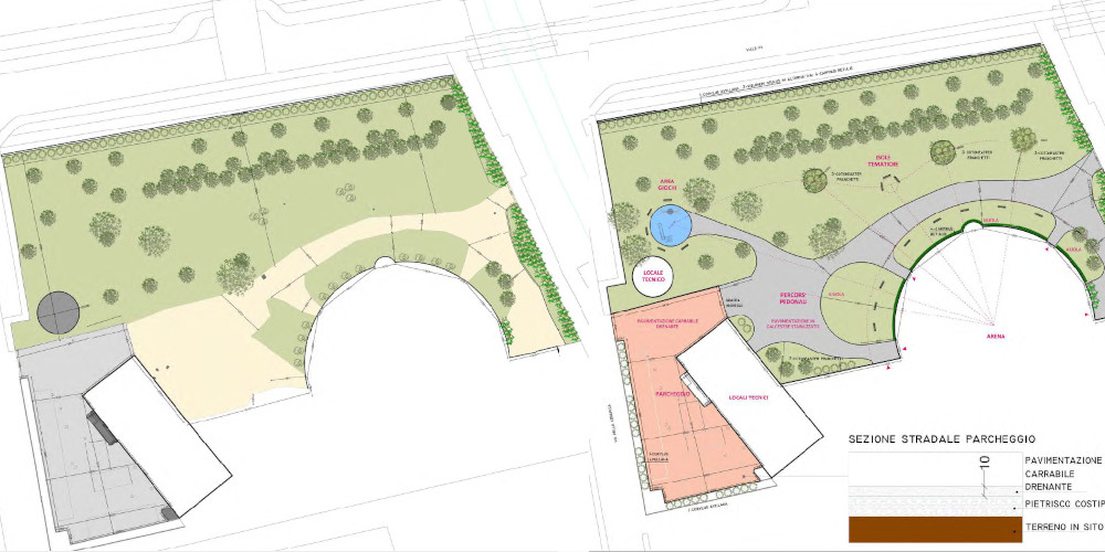 Il percorso pedonale riprende l’andamento attuale, regolarizzandolo in questo disegno d’assieme. Vengono mantenuti l’accesso da via della Ceramica, il passaggio di servizio, l’ingresso e le vie d’uscita dall’arena, nonché il collegamento con il percorso pedonale sul fronte opposto del comparto. Ci saranno poi nuovi elementi che integrano il percorso protentendolo nell’area verde più a nord: un’area giochi bambini dotata anche di panchine in plastica riciclata, posta in prossimità di via della Ceramica e pertanto in sinergia con i vicini campi sportivi di via dei Classici, ma anche alcune isole tematiche, ciascuna caratterizzata da un gruppo arboreo-arbustivo con una specifica connotazione paesaggistica ed ecologica. Verranno poi posizionate nuove panchine e rastrelliere per le biciclette.