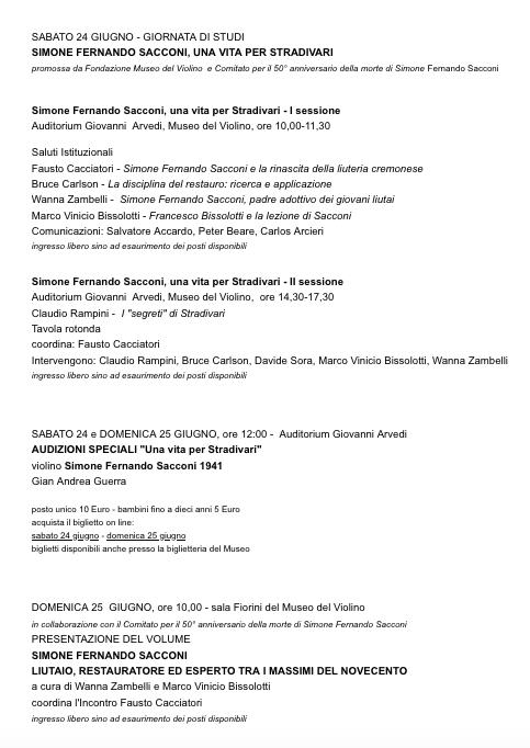 Con una mostra, una giornata di studi, audizioni e incontri, il Museo del Violino, in collaborazione con un Comitato promosso da Wanna Zambelli e Marco Vinicio Bissolotti, ricorda, nel cinquantesimo della scomparsa, la figura e l’opera di Simone Fernando Sacconi (30 maggio 1895 Roma – 26 giugno 1973 Point Lookout, New York).