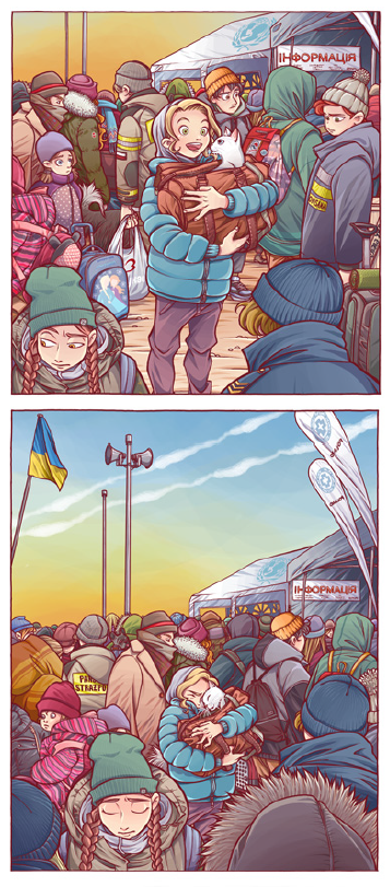 “9 Vite” consiste in strisce a colori, proposte in formato verticale per essere lette sugli smartphone, pubblicate sul sito del Centro Fumetto, alla pagina https://www.cfapaz.org/webcomics/9Vite.html . Il registro narrativo è focalizzato sui comportamenti dei felini. Ogni striscia ha come protagonista un gatto diverso e quasi tutte strappano un sorriso. Ma ce n’è una molto commovente, dove vediamo un gatto con la sua padroncina in un campo profughi ucraino.