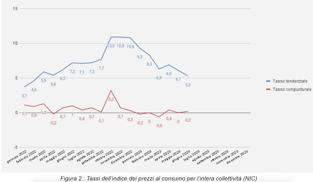 Prosegue la lenta discesa dell’inflazione generale (attualmente, +5,3% è il tasso tendenziale), con la consueta eccezione, in particolare, degli alimentari, il cui elevato tasso tendenziale medio (+11%) è trascinato verso l’alto soprattutto a causa del pane (+10,6%), del latte (+13,4%), dell’olio (14,7%), e dei vegetali (+17,1%).