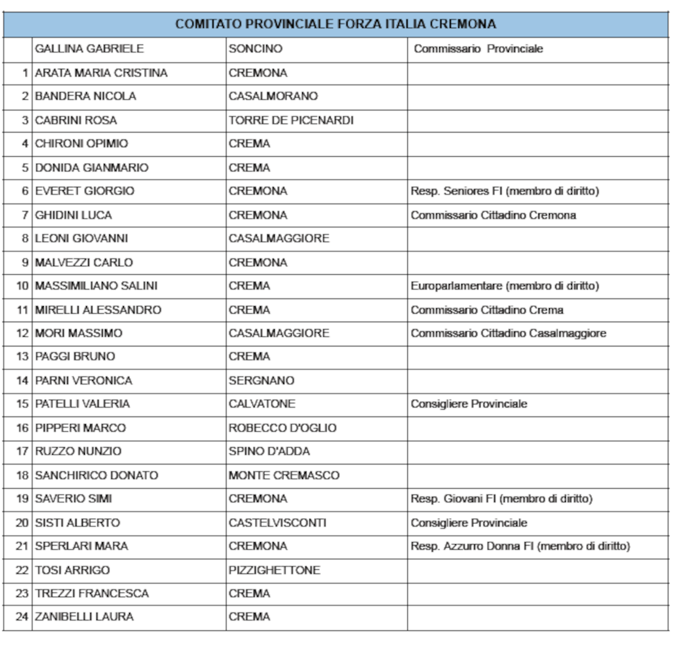Il Commissario Provinciale di Forza Italia Cremona Gabriele Gallina ha nominato il nuovo Comitato Provinciale. I componenti nominati sono venti, tra cui i due consiglieri provinciali e i tre commissari di Cremona, Crema e Casalmaggiore. Fanno parte del Comitato Provinciale anche quattro componenti di diritto: l’europarlamentare Massimiliano Salini e i tre responsabili provinciali di Azzurro Donna, Giovani e Seniores.
